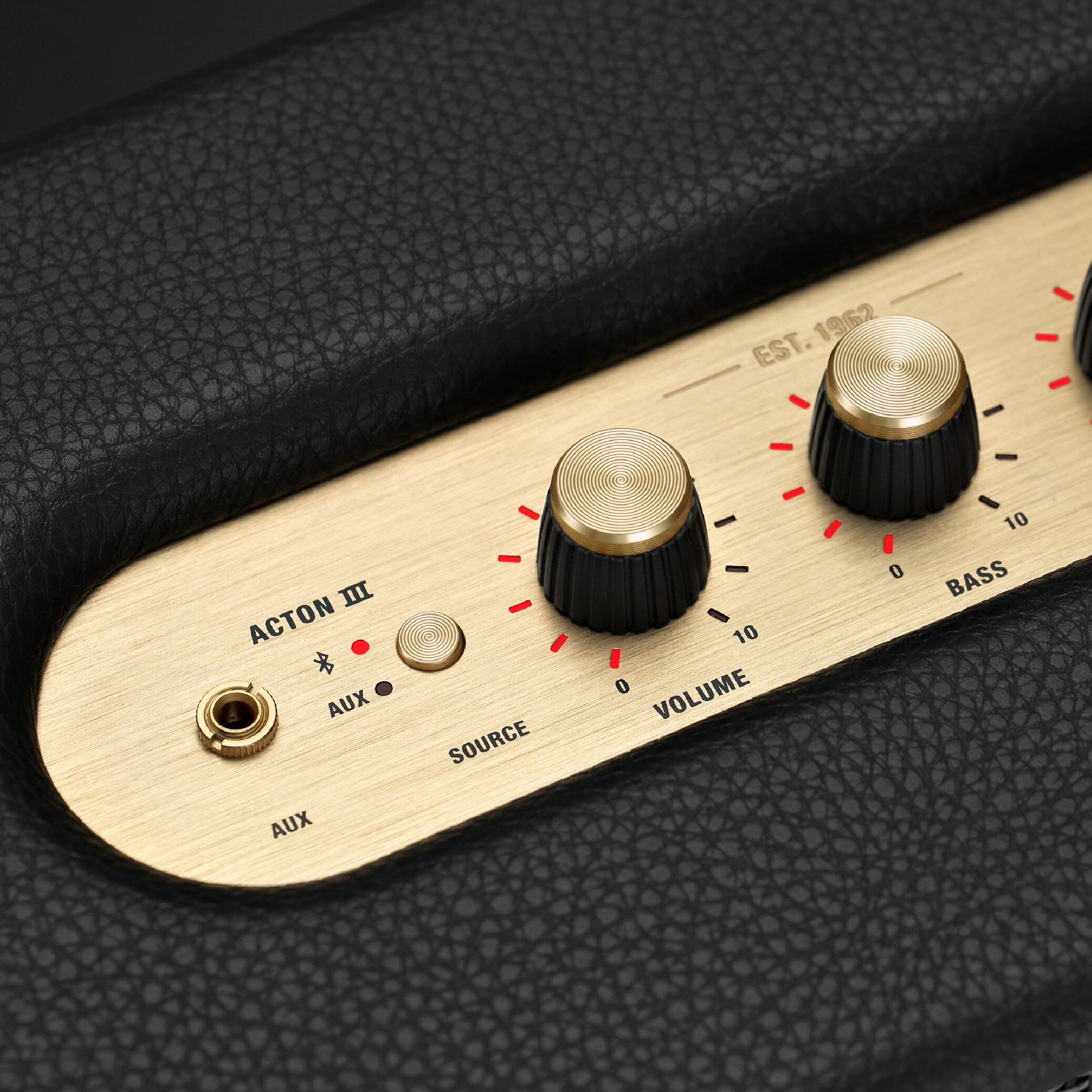 Acton III has an even wider soundstage than its predecessor, delivering room-filling Marshall signature sound that has been re-engineered for a more immersive experience. This new generation of Acton has tweeters angled outwards and updated waveguides to deliver a consistently solid sound that is so wide it chases you around the room. Acton III also features Dynamic Loudness, which adjusts the tonal balance of the sound to ensure your music sounds brilliant at every volume.
