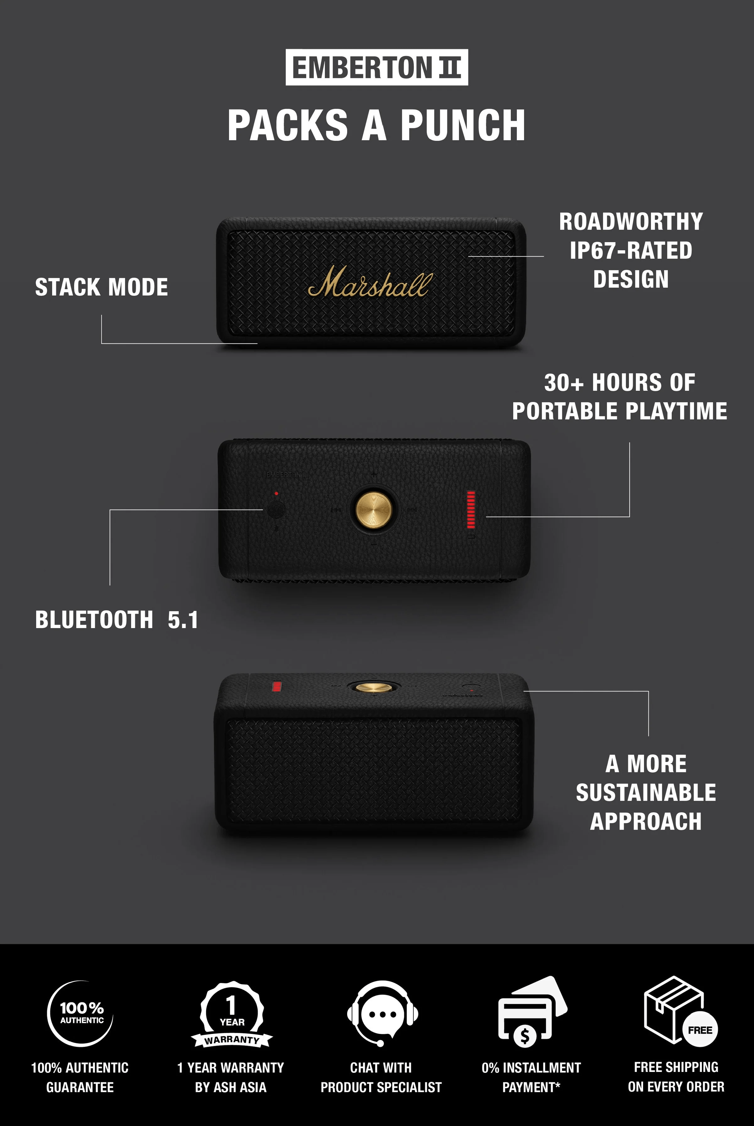 Emberton II is a compact portable speaker with the loud and vibrant sound only Marshall can deliver. Two 2’’ full range drivers and two passive radiators bring you the heavy Marshall sound you know and love.