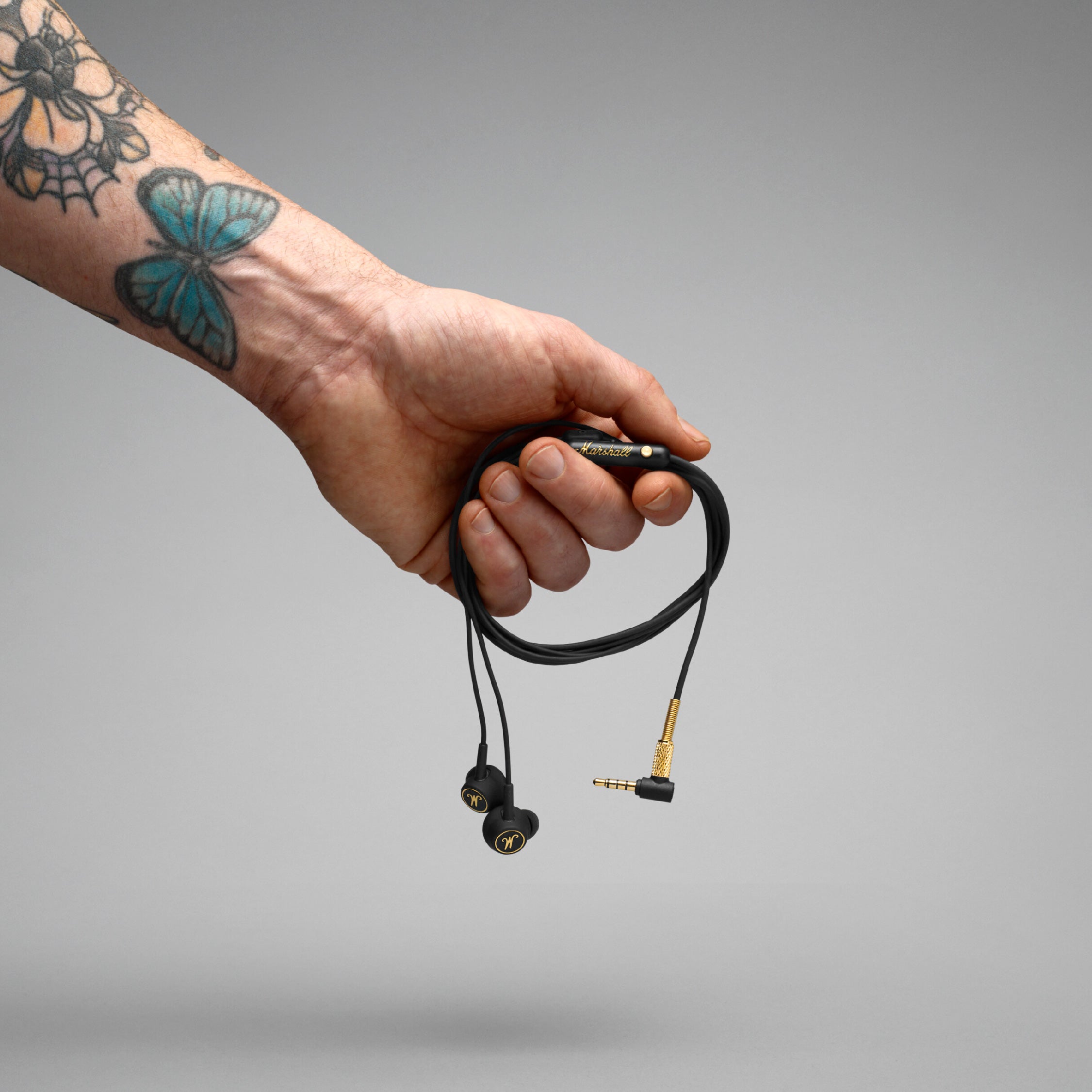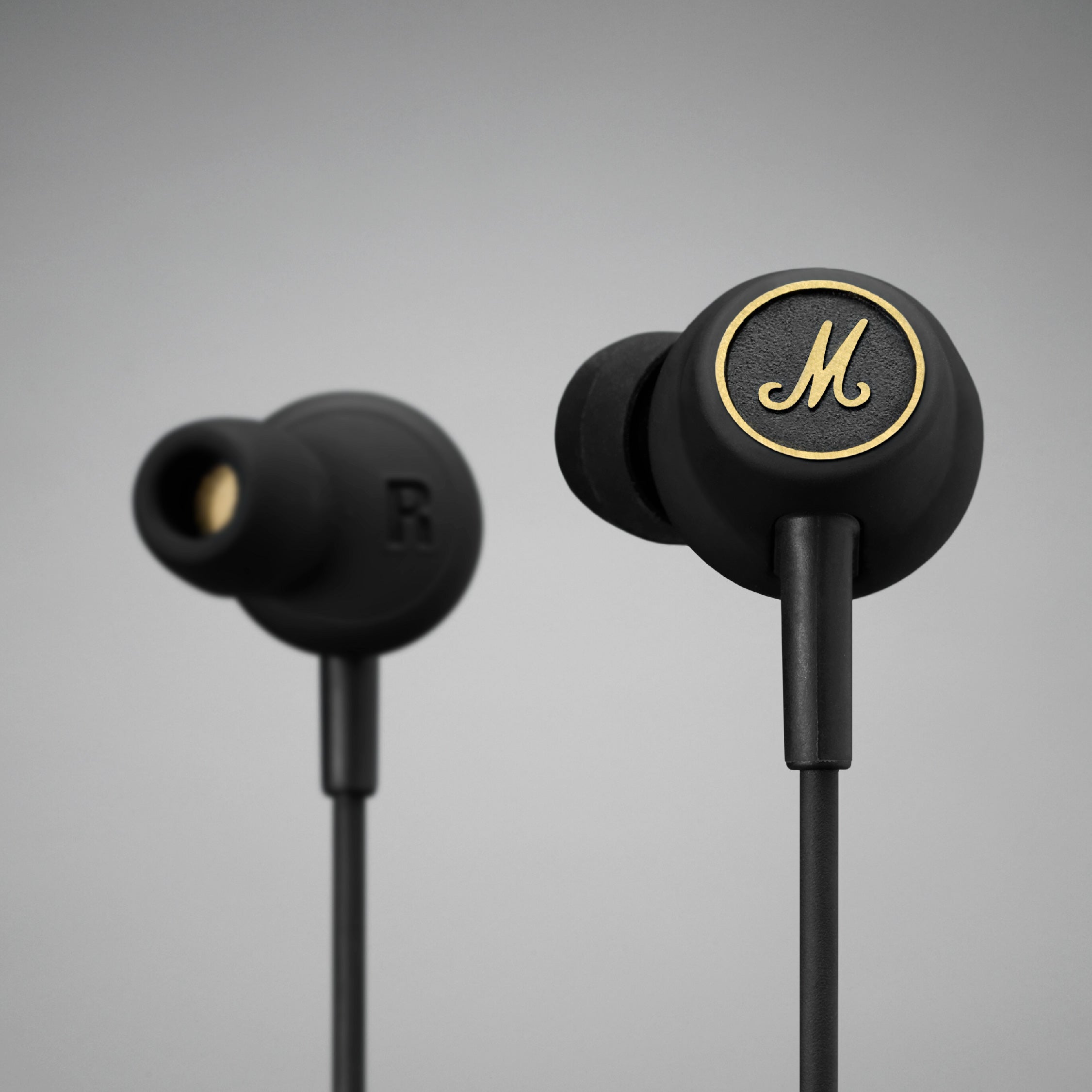 Mode EQ features the iconic Marshall script on the cable clip and Marshall brass M logo onthe earbuds.