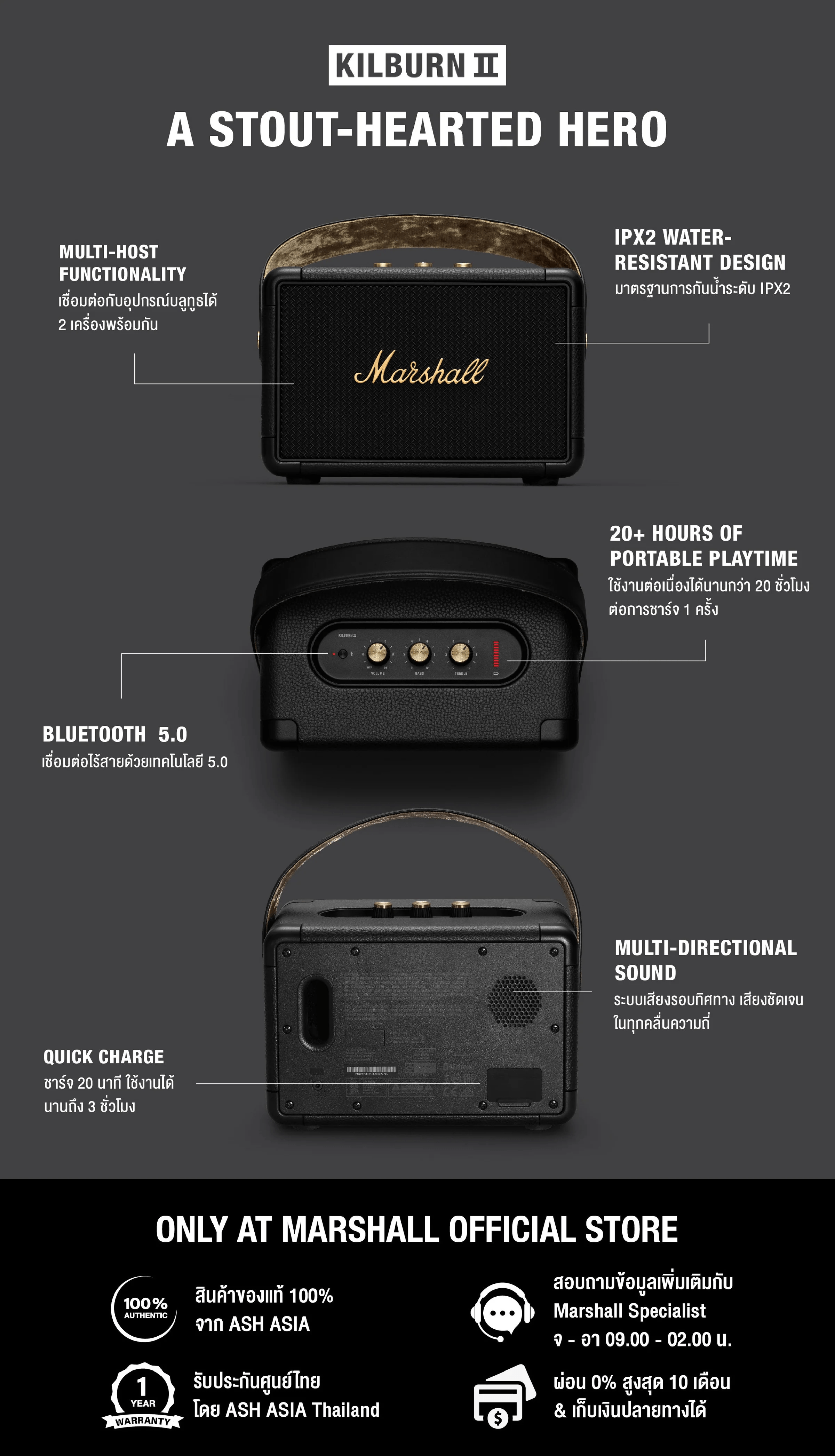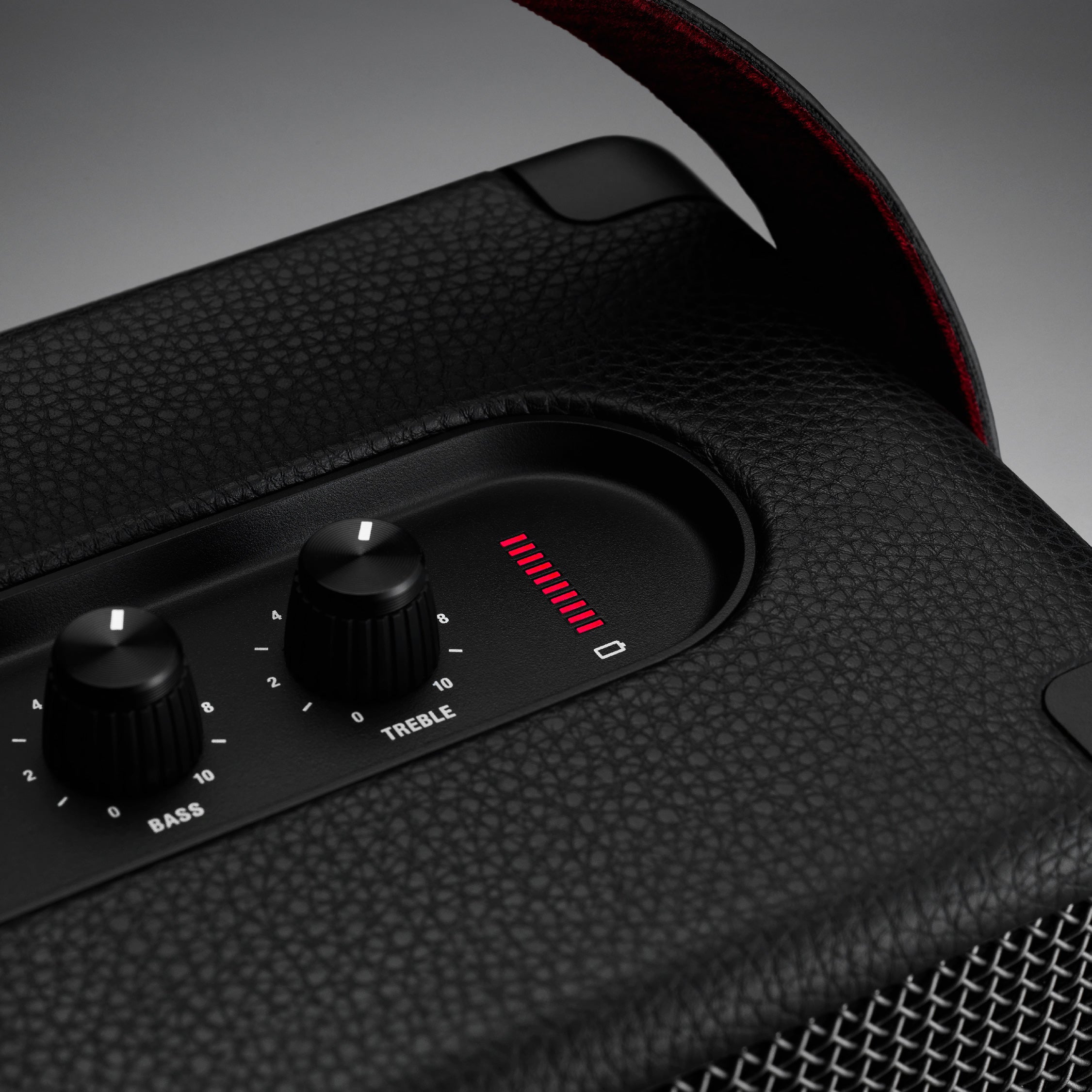 GET ON THE ROAD WITH KILBURN II. FREE FROM THE CONFINES OF WIRES AND CORDS, THIS BLUETOOTH SPEAKER OFFERS 20+ HOURS OF PORTABLE PLAYTIME ON A SINGLE CHARGE. THIS STOUT-HEARTED HERO WEIGHS ONLY 3 kg AND IS THE LOUDEST SPEAKER IN ITS CLASS. IT PRODUCES A CLEAR MIDRANGE, DEEP BASS AND EXTENDED HIGHS THAT ARE UNRIVALLED FOR A SPEAKER THIS SIZE, AND ITS MULTI-DIRECTIONAL SOUND WILL IMMERSE YOU IN YOUR MUSIC, INDOORS OR OUT.