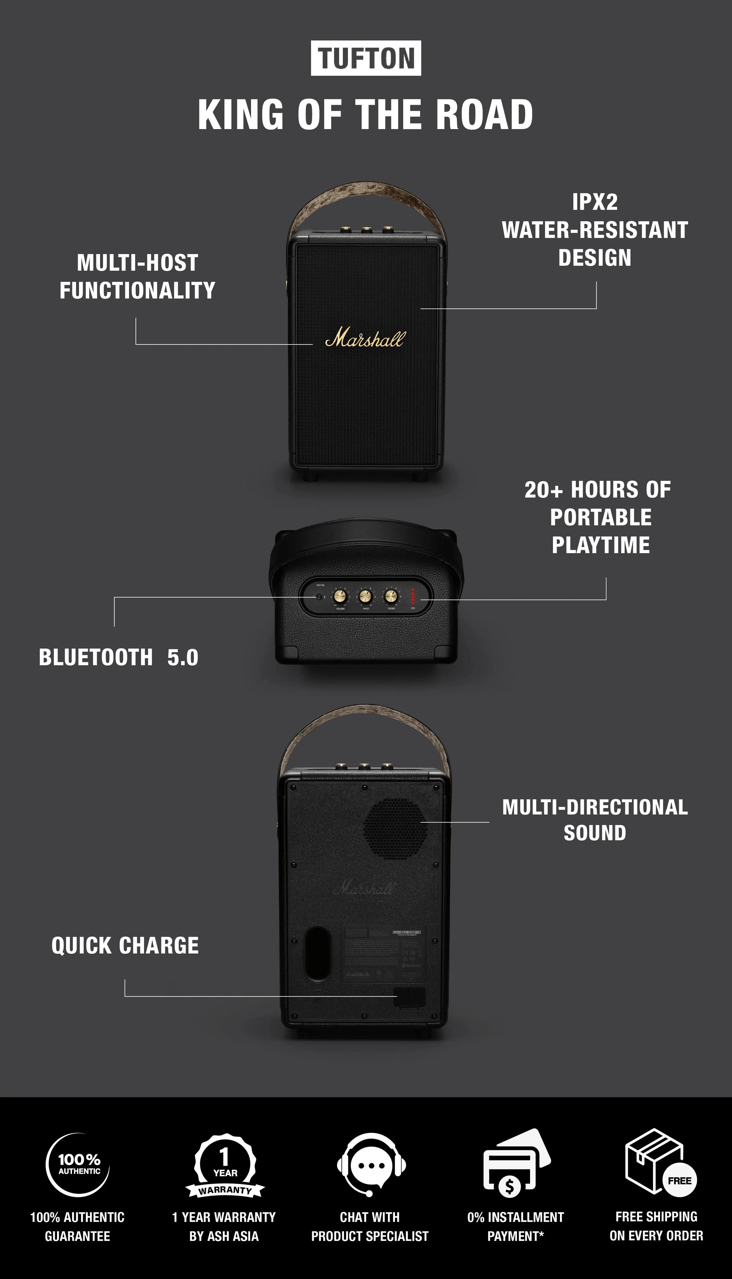 Bring the show on the road with Tufton, the mightiest portable speaker from Marshall. Tufton packs 20+ hours of portable playtime, allowing you to go further, for longer. Bluetooth® 5.0 technology allows you to connect to a variety of wireless devices with a range of 30ft.