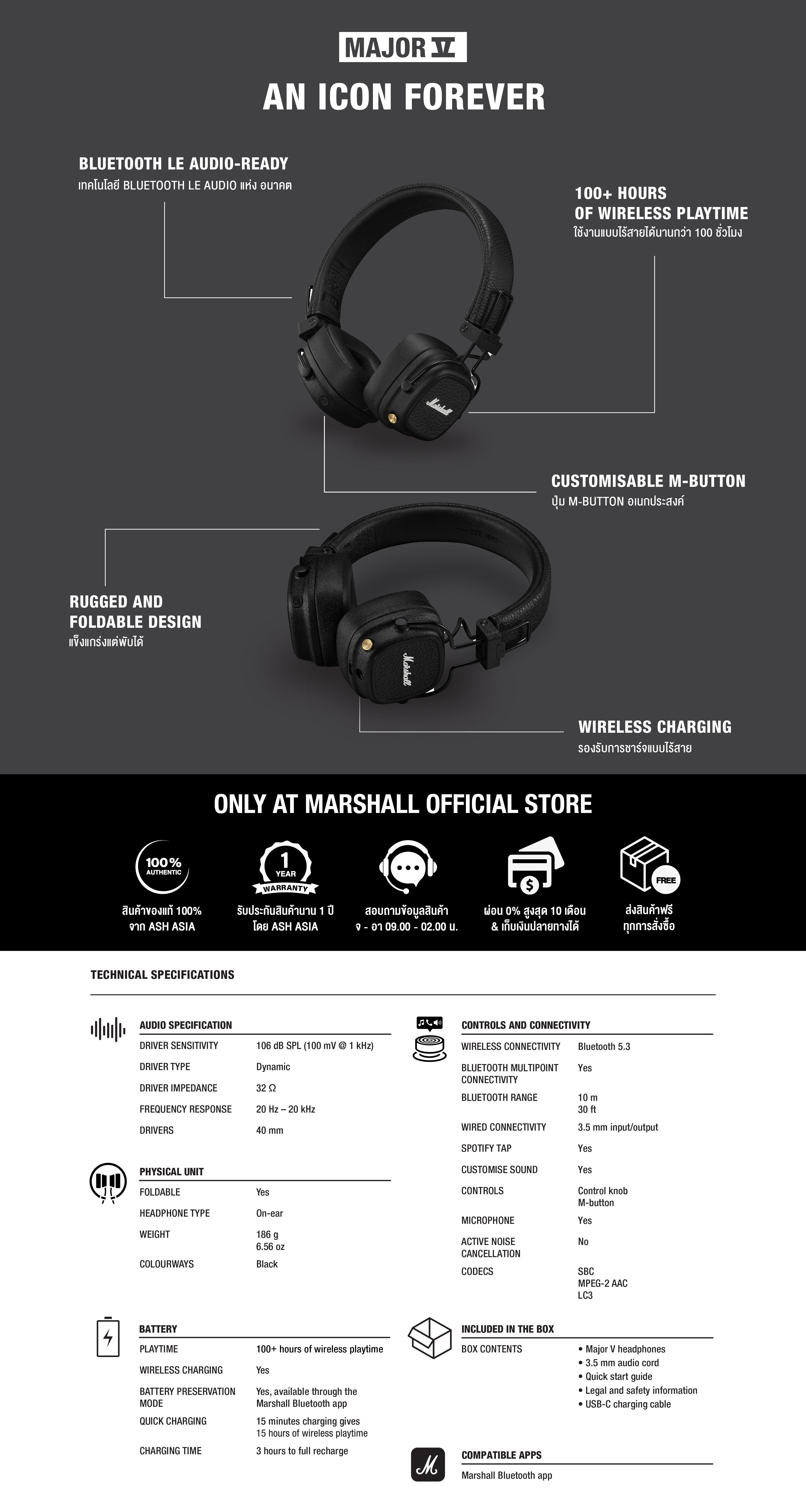 ตั้งแต่เสียงอันเป็นเอกลักษณ์ของ Marshall ไปจนถึงดีไซน์สุดคลาสสิก ทุกรายละเอียดของหูฟังนี้ได้รับการปรับแต่งอย่างพิถีพิถัน การใช้งานแบบไร้สายนานกว่า 100+ ชั่วโมง มาพร้อมกับการออกแบบที่ง่ายต่อการพกพา Major V จะเป็นคู่หูที่ดีที่สุดในการเดินทางคนใหม่ของคุณ
