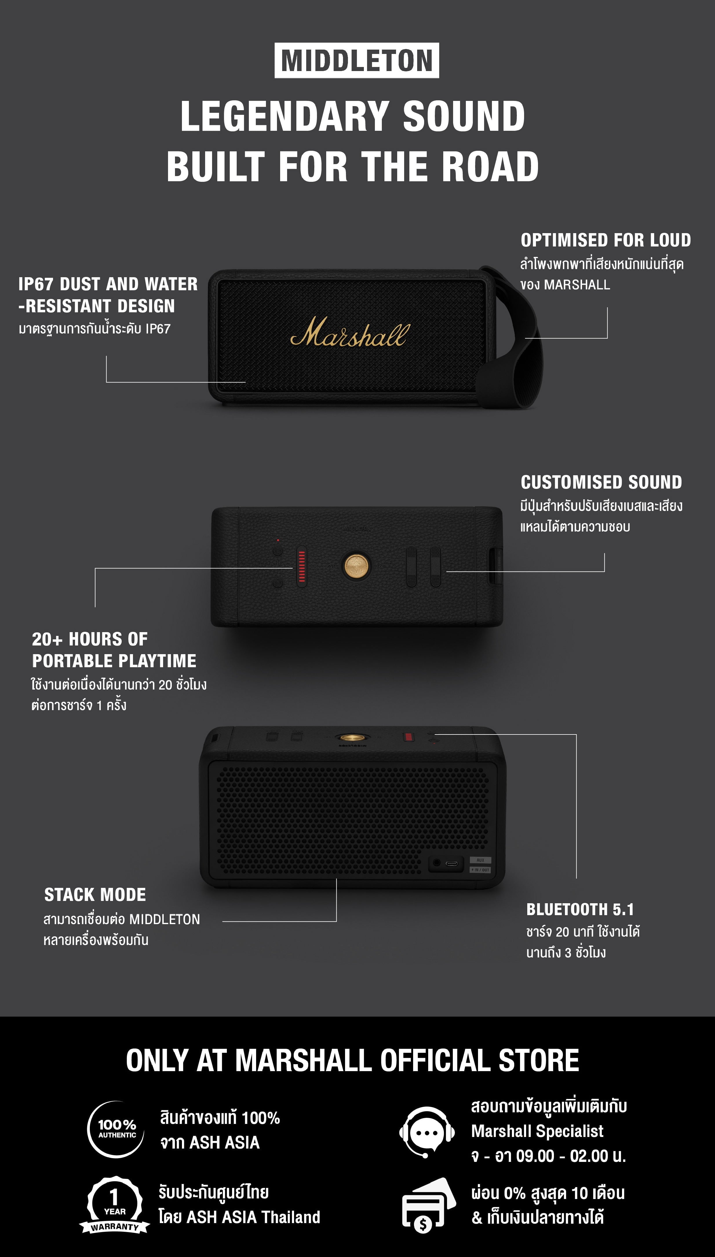 พกพาเสียงอันทรงพลังที่สุดไว้ในมือของคุณ Middleton นำ True Stereophonic ระบบการให้เสียงหลายทิศทางอันเป็นเอกลักษณ์ของ Marshall มาใช้เพื่อมอบประสบการณ์เสียงที่ดังที่สุดที่ลำโพงขนาดพกพาจะสามารถทำได้