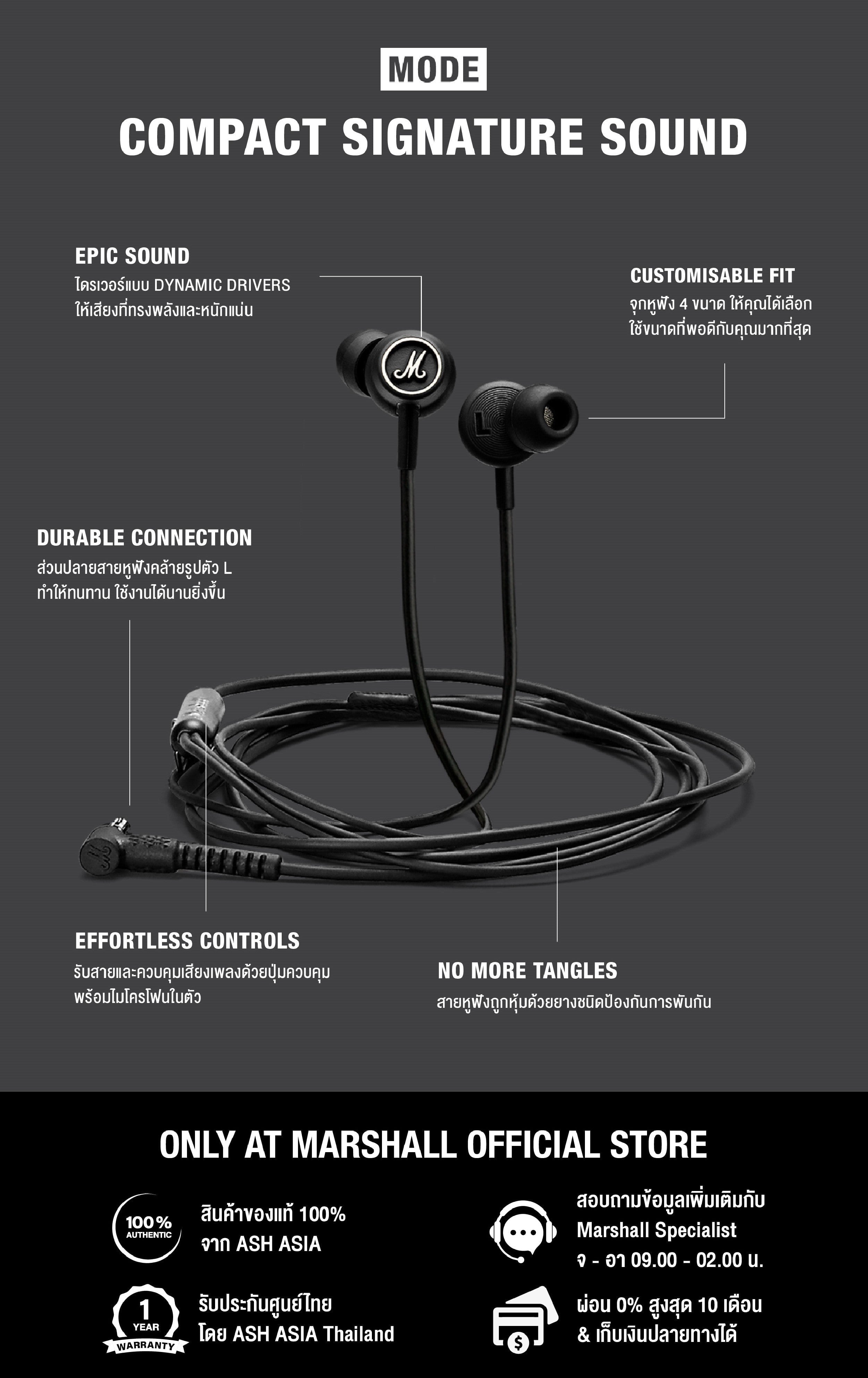 Mode ให้เสียงที่มีคุณภาพเกินตัวที่มาในขนาดกะทัดรัด ด้วยไดรเวอร์ขับเสียงแบบ dynamic drivers ที่สามารถปรับแต่งเสียงให้ได้เสียงที่ทรงพลังและหนักแน่น ดีไซน์ที่ไม่เหมือนใครของ Mode ทําให้ตัวหูฟังเข้ารูปพอดีกับหูของคุณ มาพร้อมกับจุกหูฟัง 4 ขนาด ที่ให้คุณได้เลือกขนาดที่พอดีกับคุณที่สุด นอกจากนี้ หูฟังรุ่นนี้ยังมาพร้อมกับปุ่มควบคุมและไมโครโฟนในตัว พูดได้เลยว่า หูฟังแบบอินเอียร์รุ่นนี้คือส่วนประกอบที่ลงตัวระหว่างเสียงแบบฉบับเฉพาะของ Marshall, ฟังก์ชันการใช้งานง่าย และดีไซน์อันเป็นเอกลักษณ์ ออกมาเป็นเสียงอันเป็นเอกลักษณ์ขนาดพกพาตามแบบฉบับของ Marshall
