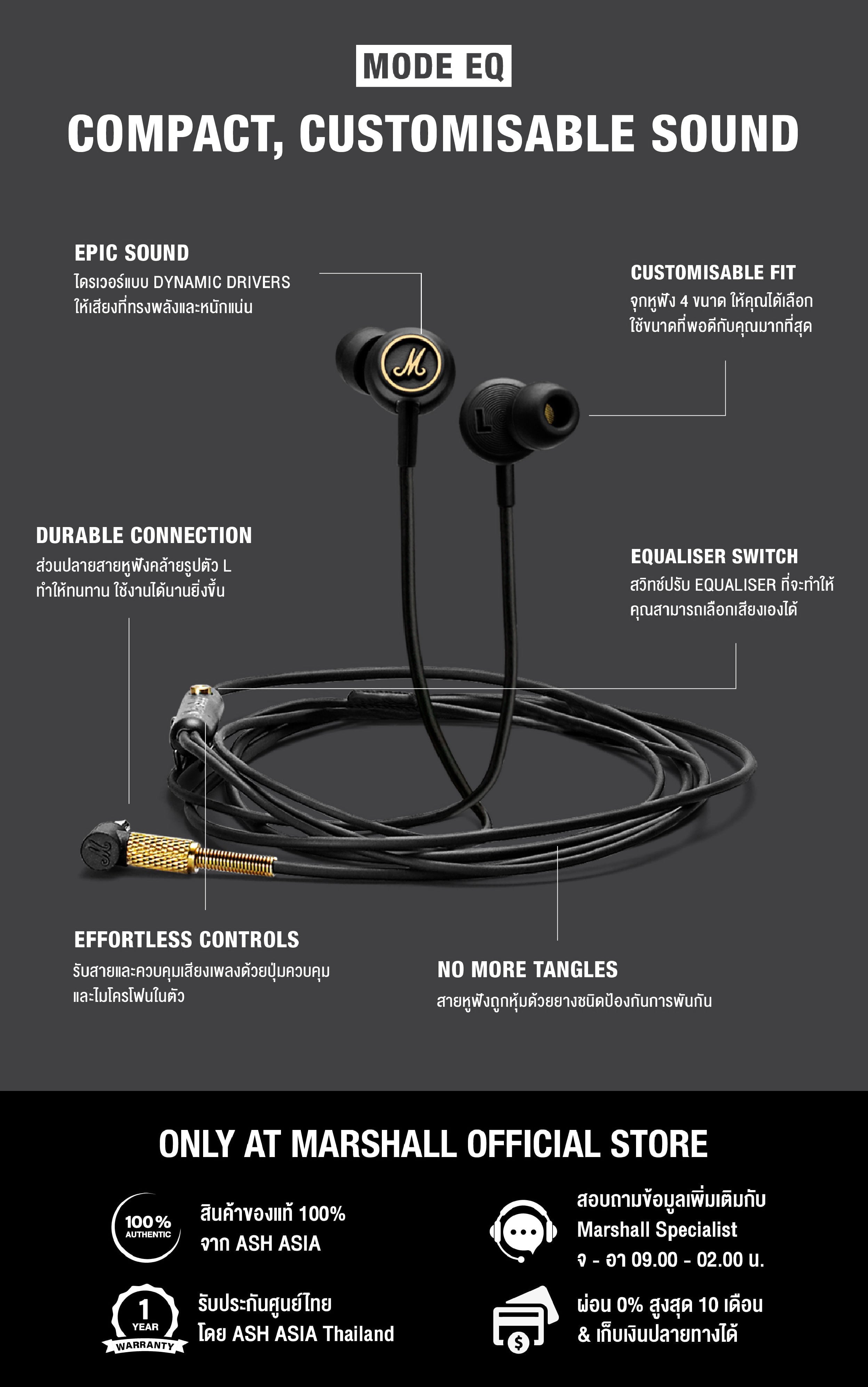 Mode EQ ให้เสียงที่ทรงพลังแม้จะมีขนาดเล็ก ด้วยไดรเวอร์ขับเสียงแบบ dynamic drivers ที่สามารถปรับแต่งเสียงให้ได้เสียงที่ทรงพลังและหนักแน่น สวิทช์ปรับ equaliser อันเป็นเอกลักษณ์ของหูฟังรุ่นนี้จะทําให้คุณสามารถเลือกบุคลิกเสียงเองได้อย่างที่ใจต้องการ ดีไซน์ที่ไม่เหมือนใครของ Mode EQ ทําให้ตัวหูฟังเข้ารูปพอดีกับหูของคุณ มาพร้อมกับจุกหูฟัง 4 ขนาด ที่ให้คุณได้เลือกขนาดที่พอดีกับคุณที่สุด นอกจากนี้ หูฟังรุ่นนี้ยังมาพร้อมกับปุ่มควบคุมและไมโครโฟนในตัว พูดได้เลยว่า หูฟังแบบอินเอียร์รุ่นนี้คือส่วนประกอบที่ลงตัวระหว่างเสียงแบบฉบับเฉพาะของ Marshall, ฟังก์ชันการใช้งานง่าย และดีไซน์อันเป็นเอกลักษณ์ ออกมาเป็นหูฟังขนาดพกพาตามแบบฉบับของ Marshall ที่คุณสามารถปรับแต่งเสียงได้ด้วยตัวเอง