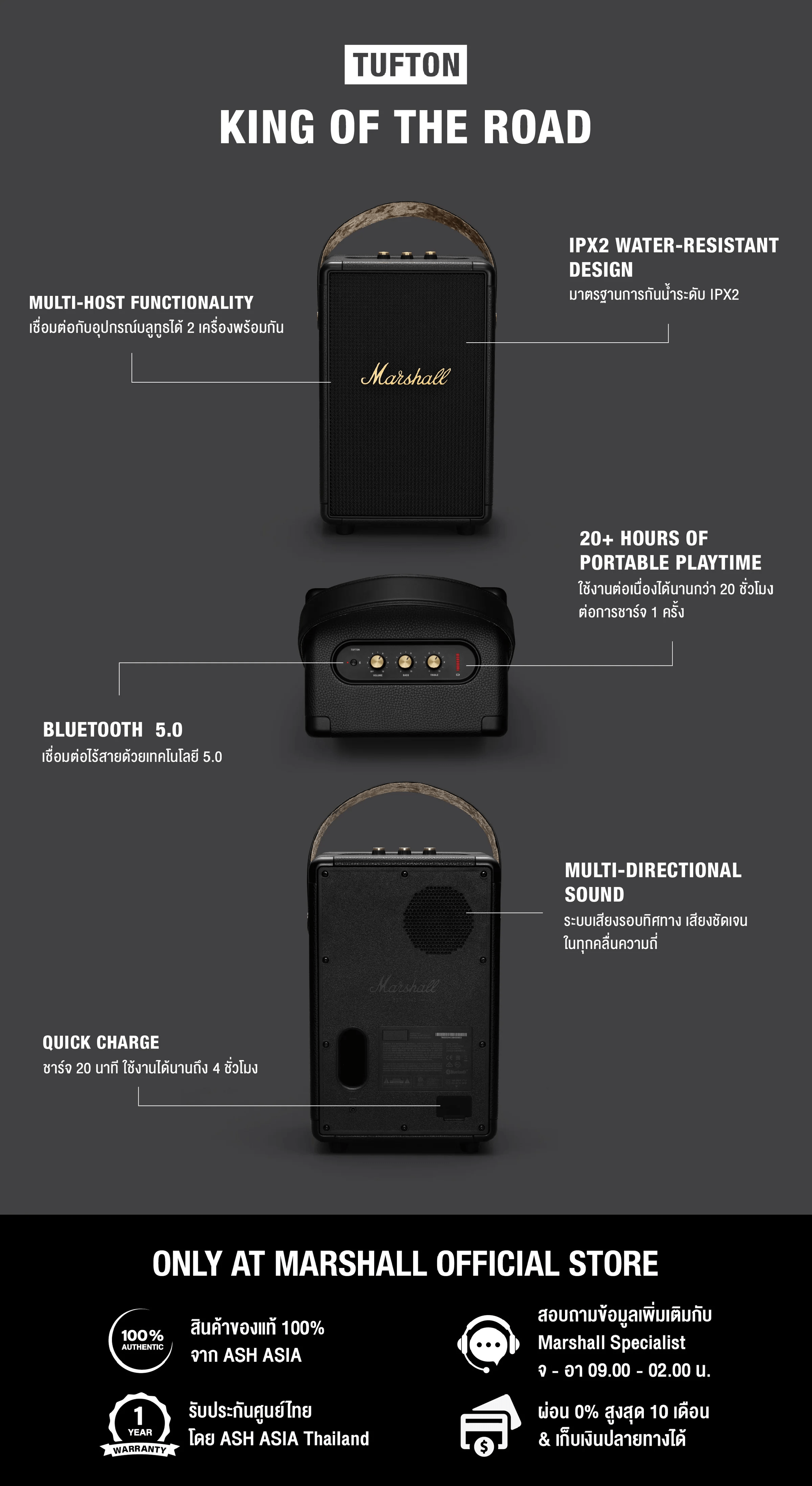 เปิดการแสดงดนตรีสดระหว่างการเดินทางไปกับ Tufton ลำโพงพกพารุ่นที่ทรงพลังที่สุดของ Marshall ซึ่งมาพร้อมกับระยะเวลาการใช้งานต่อเนื่องได้ยาวนานกว่า 20+ ชั่วโมง ให้คุณได้เพลิดเพลินไปกับเสียงเพลงได้ยาวนานกว่าไปพร้อมกับการเดินทางที่ไกลกว่าที่เคย เทคโนโลยี Bluetooth 5.0 ของลำโพงรุ่นนี้ ช่วยให้เชื่อมต่อกับอุปกรณ์ของคุณได้อย่างง่ายดาย โดยอยู่ภายในรัศมีไกลที่สุดถึง 30 ฟุต