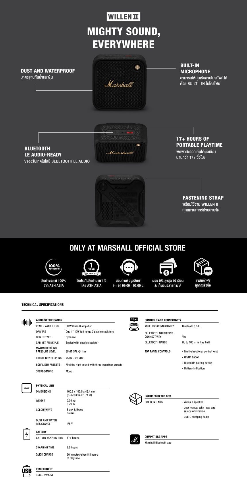เปิดโลกเสียงเพลงของคุณด้วย Willen ll ที่จะเพิ่มสีสันและเติมพลังในทุกที่ที่คุณก้าวเข้าไป ด้วยดีไซน์ขนาดกะทัดรัด พกพาง่าย สามารถเปลี่ยนพื้นที่ไม่ว่าจะที่ใดให้มีชีวิตชีวาขึ้นมาได้ทันที เปลี่ยนสวนหน้าบ้านให้กลายเป็นคอนเสิร์ตขนาดย่อม จากห้องนอนสู่สตูดิโอไลฟ์ ให้เวลาการเล่นที่ยาวนานกว่า 17+ ชั่วโมงต่อการชาร์จเพียง 1 ครั้ง มาพร้อมสายรัดเพิ่มความสะดวกต่อทุกกิจกรรมของคุณ