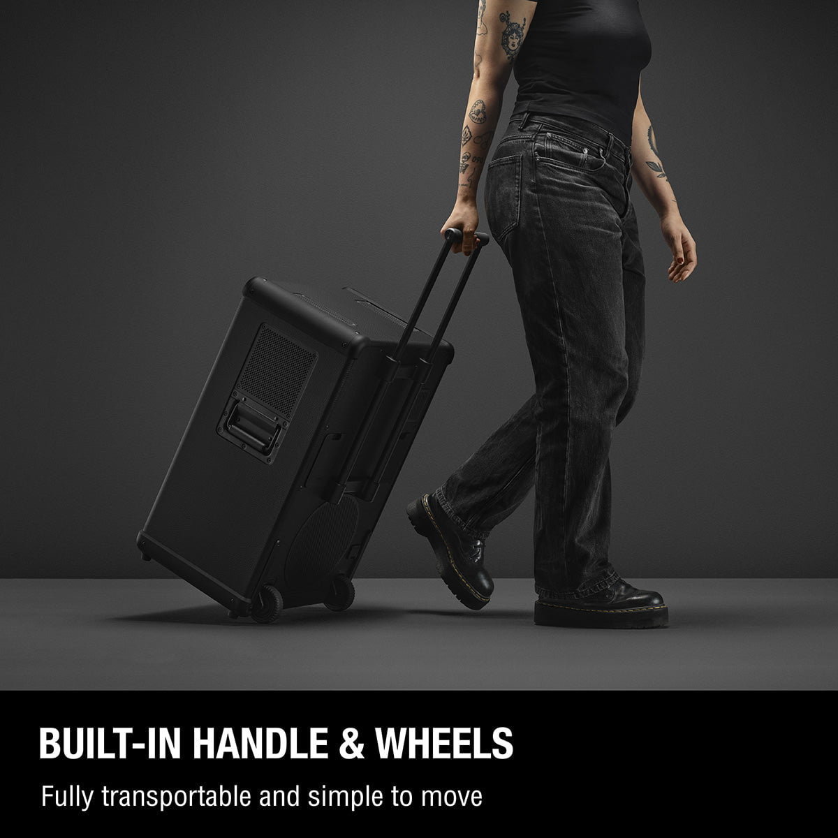 Bromley 750 is fully transportable thanks to its wheeled design and retractable handle. There’s no need for an entourage to get the party started. Tilt and use the wheels for getting out the door, then use the handles along the side to lift up and down stairs or into a car.